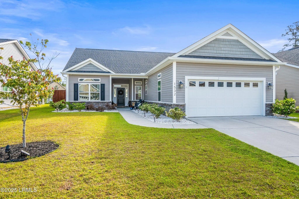 Discover comfort and contemporary living in this charming 3-bedroom, 2-bathroom home. Boasting 1,694 square feet of well-designed space, the house features a welcoming entry foyer that opens to a large great room, perfect for entertaining or relaxing. The kitchen includes a floating island, stainless steel appliances, and ample cabinet space. Natural light floods the home, enhancing the inviting atmosphere. The split bedroom floorplan ensures privacy, with a spacious primary bedroom. Enjoy outdoor living on the back patio, overlooking a fenced backyard. Hearthstone Lakes is a low HOA community with a community pool, gym, and playground.
