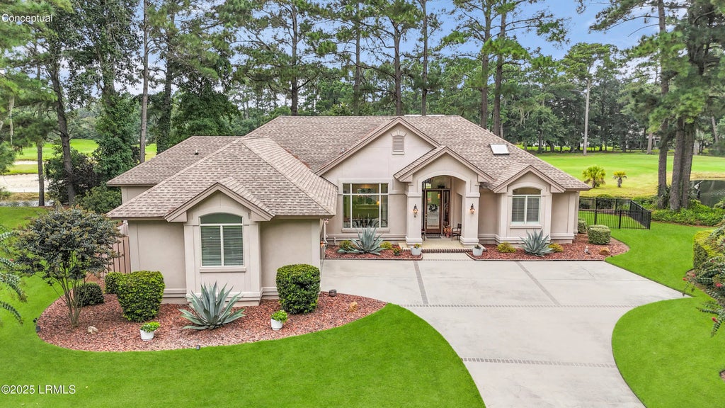 Welcome to your private sanctuary in The Crescent's coveted Victory Point, where spectacular water and golf views set the stage for Lowcountry living. This 4-bed, 3.5-bath single-story home blends privacy with resort-style amenities. Inside, an open, light-filled plan features soaring ceilings, skylights, and abundant windows. Bedroom separation is ideal with three en-suites, including a primary retreat with dual walk-ins. Formal and casual dining and living areas offer flexibility, while the dining rooms built-ins and dry bar flow seamlessly to the kitchen for effortless entertaining. A spacious laundry, walk-up attic, and oversized garage provide exceptional storage. Living spaces open to a large patio overlooking a serene lagoon and sweeping golf vistas perfect for morning coffee or evening gatherings. The cul-de-sac setting and fenced yard enhance privacy and relaxation. The Crescents 540 acres wind through ancient oaks, tidal marshes, and the semi-private Arnold Palmer Signature golf course. Residents enjoy two gated entries, golf-cart living, and exclusive access to a clubhouse, pool, tennis, and pickleball - All with affordable HOA dues. Just minutes to Old Town Bluffton, Hilton Head beaches, and a short drive to Savannah, this home offers more than a home. It's a lifestyle.