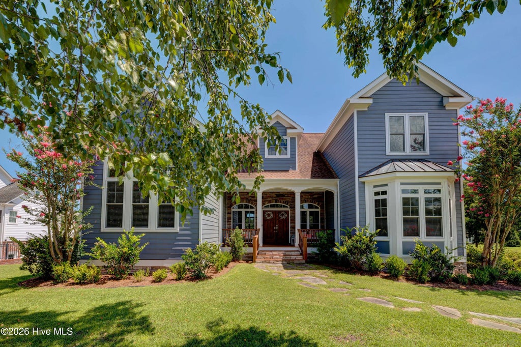 This stunning custom-built home in the highly sought-after Scotts Hill Bluff community is sure to impress. Enjoy a Wilmington address while benefiting from the desirable Pender County/Topsail School District. Upon entering through the double front doors, a grand two-story foyer welcomes you with beautiful natural hickory floors and an abundance of natural light streaming through expansive windows and doors. The great room features a soaring stone gas fireplace as its centerpiece and is pre-wired for a mounted television. Large windows and double doors at the rear of the home open to a spacious deck with a built-in gas grill, offering breathtaking views of the pool, marsh, and Foy's Creek. One of three deck access points leads back inside to a convenient half bath, laundry room with wood shelving, and a casual dining area. The gourmet kitchen is truly a chef's dream, showcasing custom soft-close, frameless full-overlay cabinetry and a complete Jenn-Air appliance package, including a refrigerator, dishwasher, six-burner gas range with griddle, oven, built-in microwave, warming drawer, and wine refrigerator. Additional highlights include a butcher block island with prep sink, oversized triple-basin sink, wine rack, pot filler, pantry with solid wood shelving, and generous cabinet and counter space. Just beyond the stairwell, the formal dining room features custom wainscoting, perfect for hosting gatherings. The main-level primary suite offers a private retreat with its own electric fireplace framed by floor-to-ceiling stone, deck access, and spa-like en suite featuring a multi-head shower, jetted tub, and custom his-and-her closets. A second full bathroom with double barn doors and a tiled shower is located down the hall, along with a main-level guest bedroom featuring soaring ceilings, a shiplap accent wall, abundant windows, and a wood-shelved closet—completing this exceptional main floor layout.