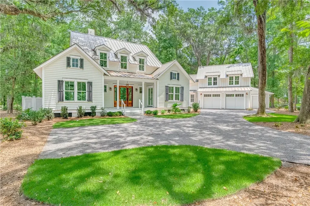 Now Complete and Move-In Ready! This stunning, newly constructed Lowcountry cottage is a brand-new offering in the exclusive Ford Field and River Club. Perfectly situated beneath a canopy of the most stunning centuries-old oaks, the home backs up to a tranquil park space for maximum privacy. Expertly designed and professionally appointed, the main house offers 4 beds and 4.5 baths across 3,167 square feet of refined living space. The open-concept floor plan includes a generous sun porch, a cozy indoor fireplace, a well-equipped wet bar, and seamless indoor-outdoor flow with an additional 650 square feet of porches—complete with an outdoor fireplace ideal for entertaining year-round. Adding to the allure is a beautifully designed detached garage with a golf cart bay and a fully finished guest suite above—featuring a kitchenette and 580 additional square feet of living space. Don’t miss this opportunity to own a brand-new home in one of the South’s most prestigious private communities.