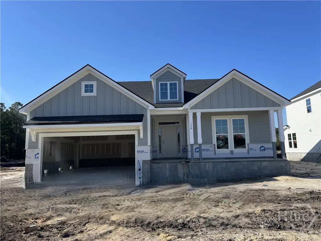 Savannah's trusted builder is offering the Roxboro plan. This one level home has a spacious and open concept design. Gourmet kitchen boasts expansive quartz counters, French door stainless frig, electric cooktop, double oven, and 42" cabinets & is finished with beautiful flanked island pendant lights. The primary suite includes a bathroom w/6' walk-in tiled shower-only. Double vanities. Full baths have quartz countertops and framed mirrors. Gorgeous click plank flooring is in main living areas, tile in the baths and laundry. BRs are carpeted. Electric fireplace in great room. Home has a level 3 ADT security system (not monitored). Outside you'll find a covered back porch, sod and irrigation. Pictures, features, and selections shown are for illustration purposes and may vary for the actual home built. All Builder incentives applied. Completion date is estimated to be Nov, '25. Virtual tour represents home plan, but not actual home. Features may vary.