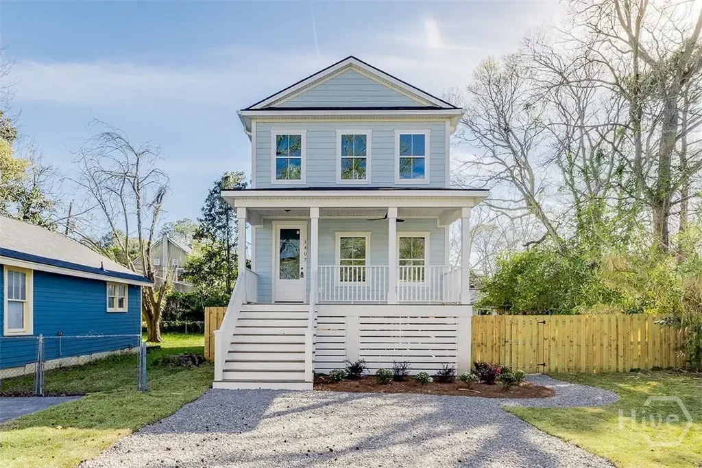 New Construction on Double Lot; modern & spacious living sits on a desirable double lot & features an open floorplan with high ceilings, offering an abundance of natural light & a sense of spaciousness throughout. The home boasts low-maintenance wood flooring, elegant quartz countertops, & upgraded moldings for a refined touch. The heart of the home is the kitchen, equipped with an eat-at island & generous walk-in pantry that provides ample storage space. Modern contemporary light fixtures enhance the home’s sleek design, while the owner’s suite offers a true retreat with a built-in walk-in closet & luxurious glass shower designed for two. With off-ground construction & spray foam insulation, this home is energy-efficient, ensuring comfort year-round. Enjoy outdoor living with both a covered front porch & covered back porch, perfect for relaxation and back yard has privacy fence.