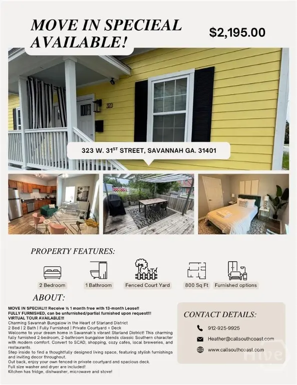 Welcome to your dream home in Savannah’s vibrant Starland District! This charming fully furnished 2-bedroom, 2-bathroom bungalow blends classic Southern character with modern comfort. Convenient to SCAD, shopping, cozy cafes, local breweries, and restaurants.