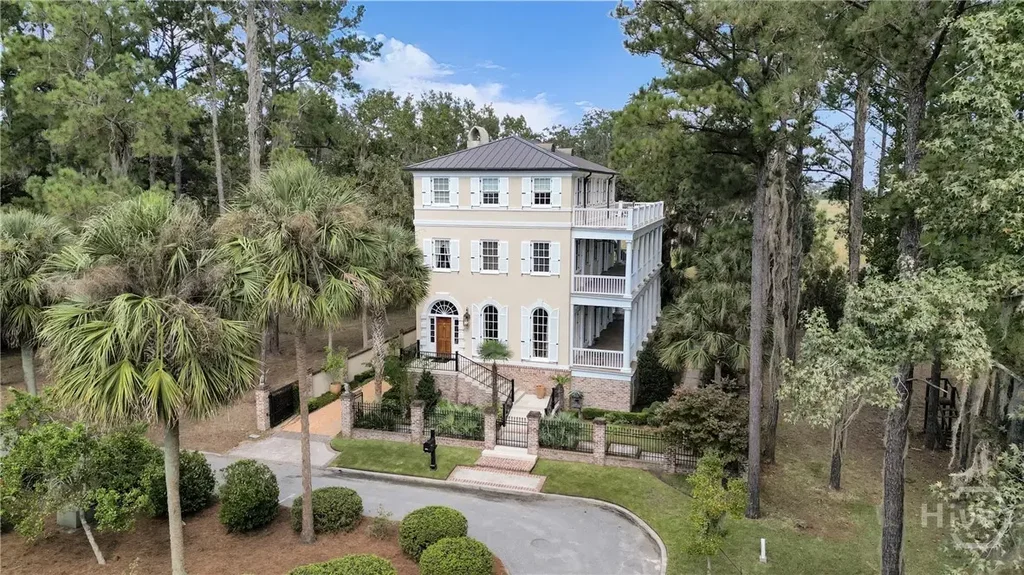 Experience timeless Lowcountry elegance in this stunning 4-bedroom, 4.5-bath home in the prestigious Ford Field and River Club of Richmond Hill. Overlooking the serene marsh and Ogeechee River, this residence offers open porches on all levels plus screened porches on the first and second for the perfect blend of indoor-outdoor living. A elevator, one-car garage, and golf cart shed add convenience, while the manicured courtyard and lush grounds create an unforgettable first impression. The main level features a library, great room with fireplace, and a kitchen ideal for entertaining. The second floor is dedicated to a luxurious primary suite with a fireplace, sitting area, and dual baths. The third level includes an office or guest retreat with full bath. Enjoy the charm of historic Savannah architecture paired with the exclusive amenities of Ford Field & River Club including golf, deepwater marina, equestrian center, trails, and more!