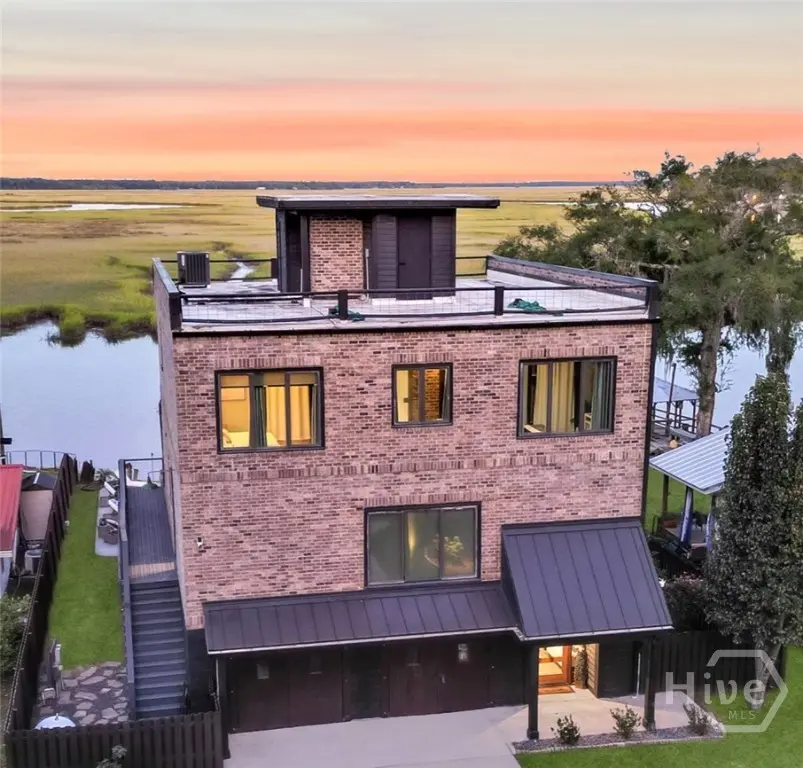 Waterfront sanctuary meets modern luxury on Jerico River! Serene sunsets w/ sweeping views from every floor of 4 bedroom, 3.5 bath deep-water oasis. Open floor plan, elevator, oak flooring, exposed brick, soaring ceilings, & walls of windows flood living area w/ natural light. Gourmet kitchen w/ wine bar, coffee bar. Main suite is private escape w/ panoramic views, spa-like bathroom & huge closets. Ground floor features 2-car garage, ½ bath & expansive flex-room opening to pool area, perfect for a game room, media room or guest space. Ground-floor patio w/ tons of outdoor storage & outdoor shower. Multiple outdoor living areas-expansive ground-floor patio, massive 2nd floor deck just off kitchen/main living area, fiberglass cocktail pool, & private covered dock w/ new decking. Currently STVR w/ solid rental history. Furnishings are negotiable-potential turn-key STVR. No flood insurance required & no HOA.30 minutes to Savannah, 20 minutes to Hinesville, 15 minutes to Richmond Hill.