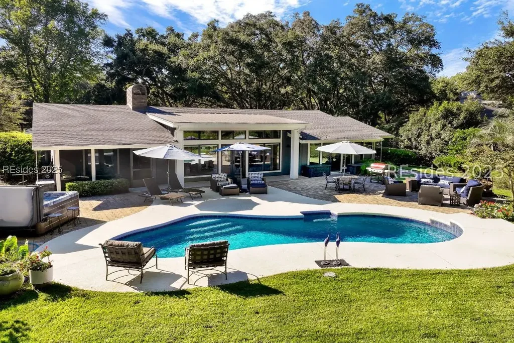 Island living at its best! This stunning, single-story Port Royal home has been completely remodeled & expanded, blending coastal ease w/ modern luxury. The open layout is designed for gathering from the gourmet kitchen w/ expanded center island, seating for 6, walk-in pantry, to the inviting living, dining & media spaces w/ fireplace, built-ins & beverage center. Walls of windows frame the paved patio, private pool, hot tub & lush landscaping along the golf course. The primary suite is a serene retreat w/ screen porch, soaking tub & steam shower, while 3 guest BRs are set apart for privacy. With 2 offices, climate-controlled storage, & an oversized 2-car garage w/ epoxy floors, this approx. 3,600 sq. ft. home offers the perfect balance of lifestyle, comfort & function. Owners enjoy beach access, pool, tennis/pickleball, beach house, playground, leisure trails, security & more all w/ the peace of no short-term rentals.